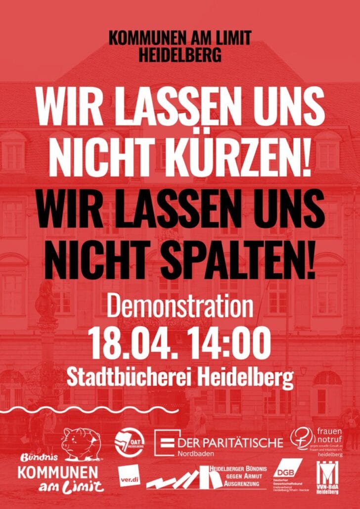 wir stehen heute hier, weil die Stadt Heidelberg allein dieses Jahr mindestens 40 Millionen Euro einspart – 40 Millionen, die vor allem dort eingespart werden, wo sie am dringendsten gebraucht werden: im sozialen und kulturellen Bereich. Dort, wo Menschen Unterstützung finden. Dort, wo Schutzräume existieren. Dort, wo Begegnung, Teilhabe und Selbstermächtigung möglich sind.