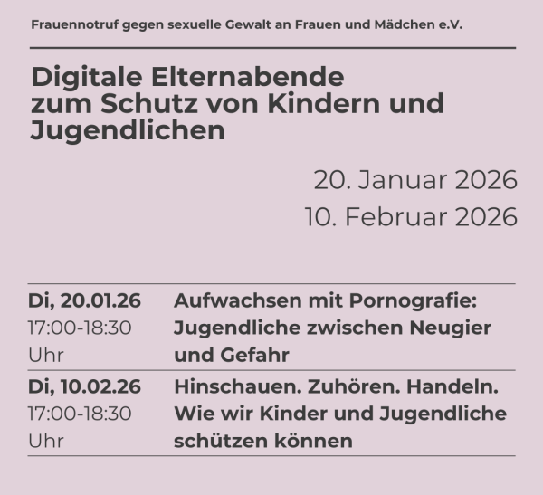 Mit unseren zwei digitalen Elternabenden möchten wir Orientierung geben, Wissen vermitteln und praktische Handlungsmöglichkeiten aufzeigen. Die Veranstaltungen beleuchten sowohl Risiken als auch Schutzfaktoren und bieten Raum für Reflexion sowie konkrete Empfehlungen für den familiären und pädagogischen Alltag.