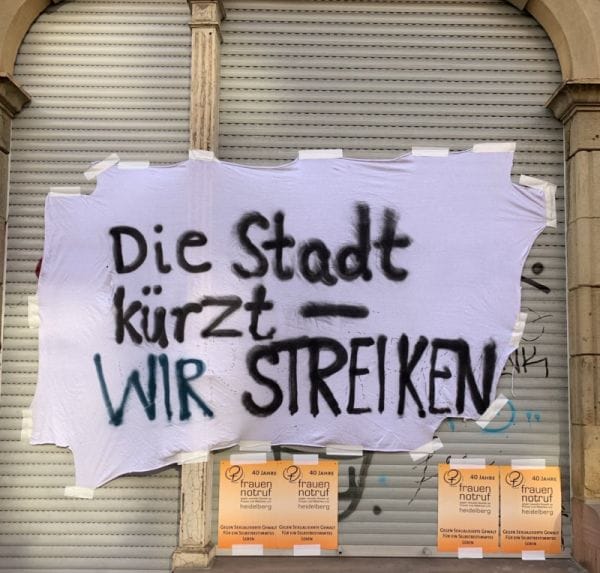 Aus Protest gegen die geplanten Haushaltskürzungen der Stadt Heidelberg hat der Frauennotruf gemeinsam mit anderen Vereinen der Arbeitsgemeinschaft Heidelberger Frauenverbände und -gruppen (Frauen-AG) am 27.11.2025 gestreikt und vor dem Rathaus eine Kundgebung abgehalten. Mit der folgenden Rede haben wir unsere Position und unsere Forderungen vertreten.