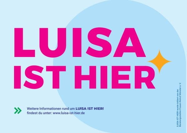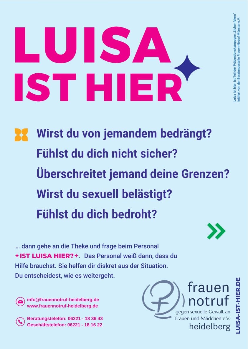 Sie fühlen sich beim Feiern oder auf der Straße bedrängt, unsicher oder bedroht? Ihr Date oder eine andere Person überschreitet Ihre Grenzen? Dann wenden Sie sich mit der Signal-Frage „Ist Luisa hier?“ an das Personal der teilnehmenden Locations und Geschäfte. Die Frage signalisiert dem Personal, dass Sie Hilfe brauchen. Sofort und ohne Fragen begleitet das Personal Sie zu einem sicheren Ort in der Location. Dort wird geklärt, welche Hilfe Sie brauchen: