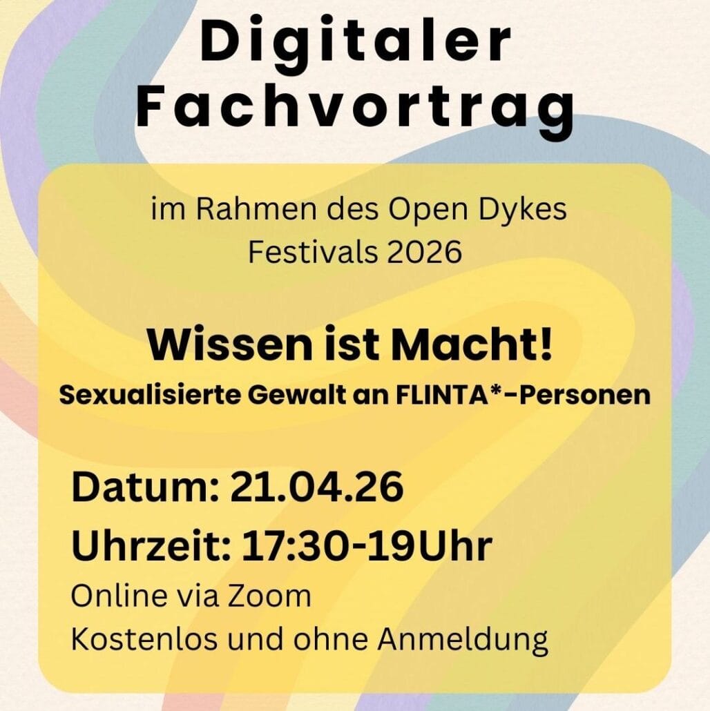 Der Frauennotruf bietet im Rahmen von OPEN DYKES 2025 einen kostenlosen und digitalen Vortrag zum Thema Sexualisierte Gewalt gegen Frauen, Lesben, intergeschlechtliche, nicht-binäre, trans und agender Personen (FLINTA*) an.